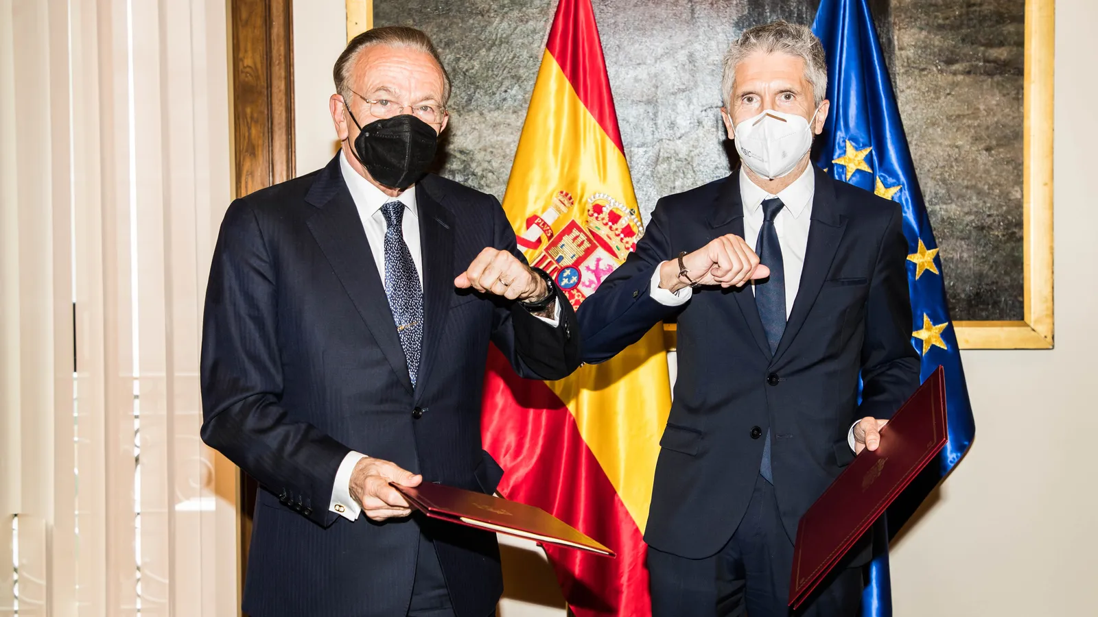 El ministro del Interior, Fernando Grande-Marlaska, y el presidente de la Fundación La Caixa, Isidro Fainé, han firmado un acuerdo de 4.215.000 euros en virtud del cual la entidad da continuidad a su programa de reinserción sociolaboral de personas privadas de libertad, especialmente ante las dificultades añadidas durante la pandemia derivada de la Covid-19, y al Programa CiberCaixas Solidarias en Centros Penitenciarios.