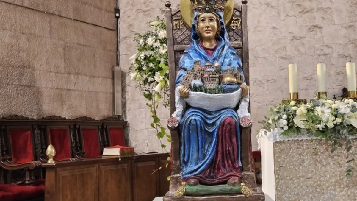 La imagen fue bendecida por el Prior de la Colegiata, David Santapau. Presidió una solemne Misa, en cuya homilía subrayó que la presencia de la Imagen de la Virgen Reina de Palestina en este templo iba a estrechar más aún los vínculos de la Orden con la Colegiata y la de los miembros de la comunidad parroquial con los hermanos de Tierra Santa por cuya paz y concordia abrogó.