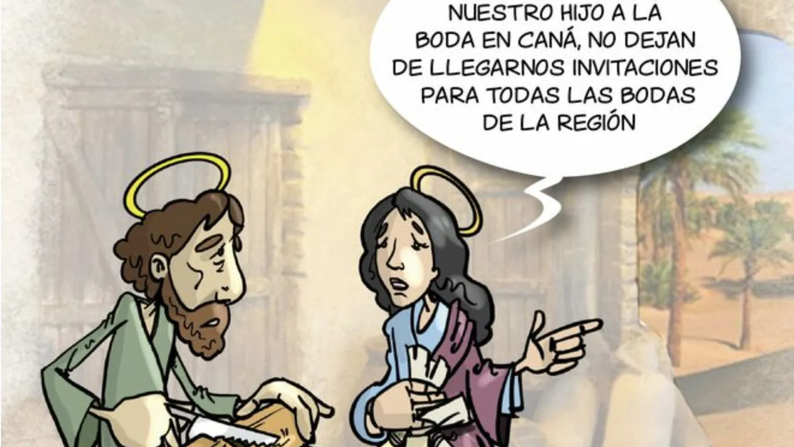 Las bodas eran en Galilea la fiesta más esperada y querida entre las gentes del campo. Durante varios días, familiares y amigos acompañaban a los novios comiendo y bebiendo con ellos, bailando danzas de boda y cantando canciones de amor. De pronto, la madre de Jesús le hace notar algo terrible: «no les queda vino». ¿Cómo van a seguir cantando y bailando?
