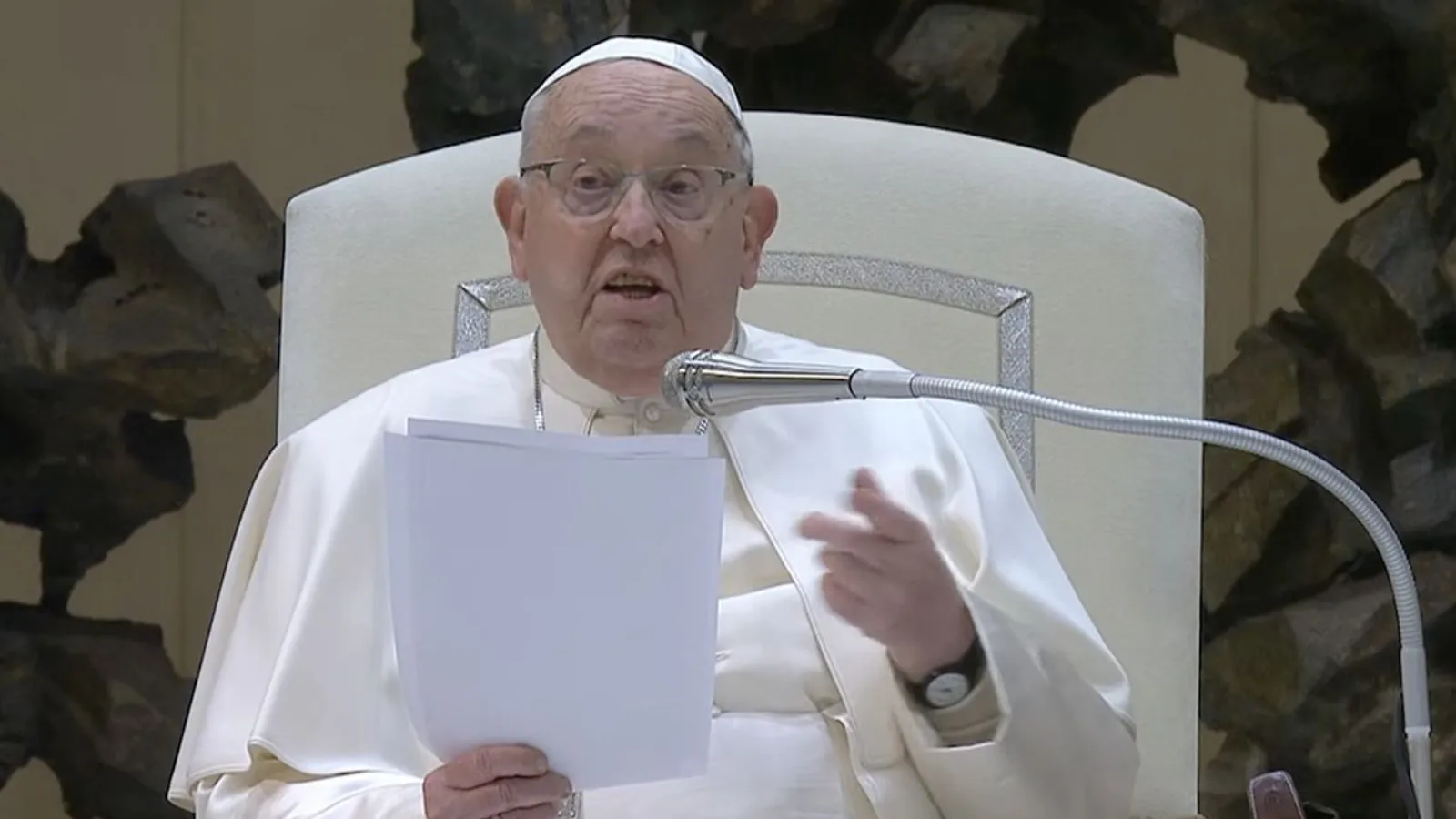 Entró Francisco caminando, apoyado en su bastón, y saludando con una amplia sonrisa a los presentes. También a los que tuvieron que seguir la audiencia desde la basílica, pues el Aula se quedó pequeña para este encuentro del primero de febrero.