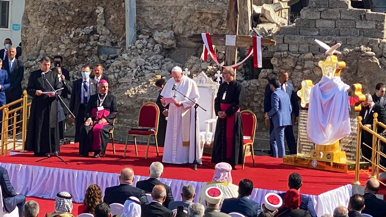"Hoy elevamos nuestras voces en oración a Dios omnipotente por todas las víctimas de la guerra y de los conflictos armados", clamó Bergoglio, sin poder evitar mirar hacia las ruinas, pero también más allá, a un futuro aún por construir. "Aquí en Mosul las trágicas consecuencias de la guerra y de la hostilidad son demasiado evidentes. Es cruel que este país, cuna de la civilización, haya sido golpeado por una tempestad tan deshumana, con antiguos lugares de culto destruidos y miles y miles de personas —musulmanes, cristianos, yazidíes y otros— desalojadas por la fuerza o asesinadas".