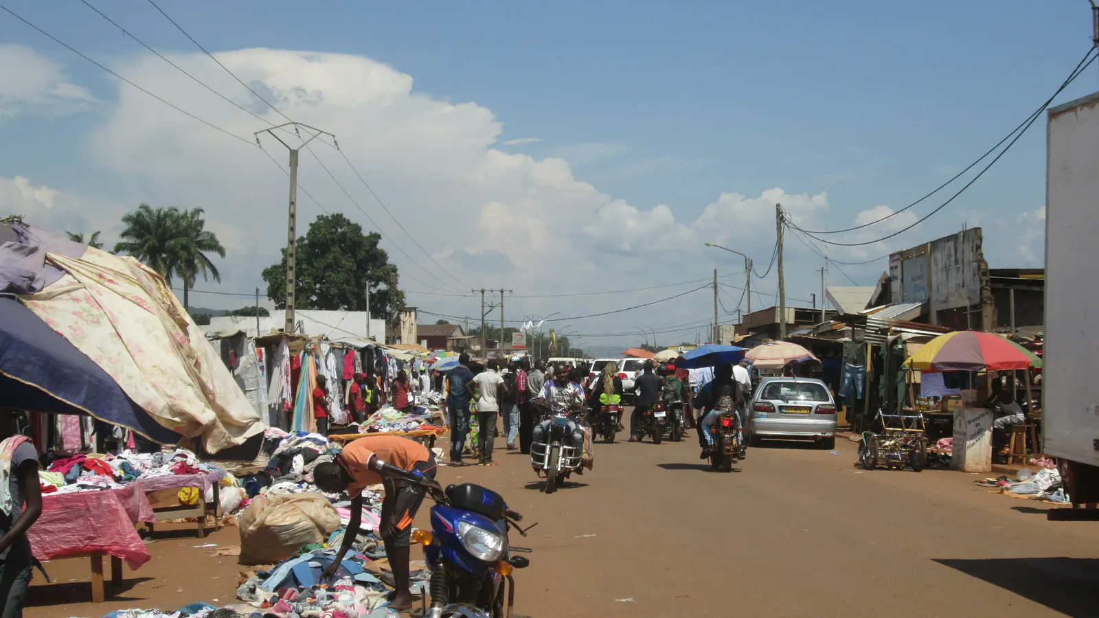 Los comerciantes del Kilometro Cinco, viendo que las cosas no están tranquilas en su sector, se trasladan con sus peluches y sus cochecitos y bicis de juguete unos ochocientos metros más abajo, al lado de un puente, que en pocos minutos se convierte en un inmenso mercado improvisado de Navidad donde acuden clientes de otras partes de Bangui los cuales, por si las moscas, compran a toda prisa y se van de vuelta a su barrio.