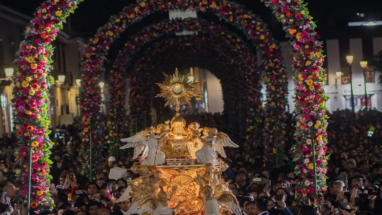La procesión del Corpus Christi a la que asistieron miles de personas, se realizó por el perímetro de la plaza de armas de Trujillo que fue adornado con 37 arcos florales