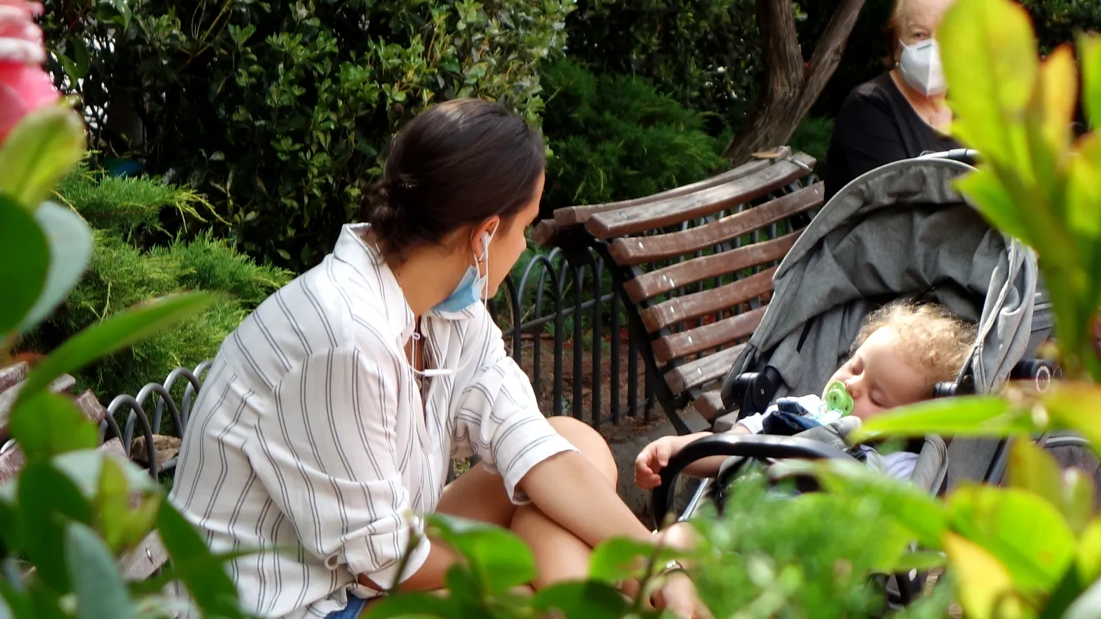 Una instantánea en medio de la covid. La anciana (arriba a la derecha) mira con interés, parapetada en su mascarilla, a la joven madre que vigila con amor a su bebé dormido.